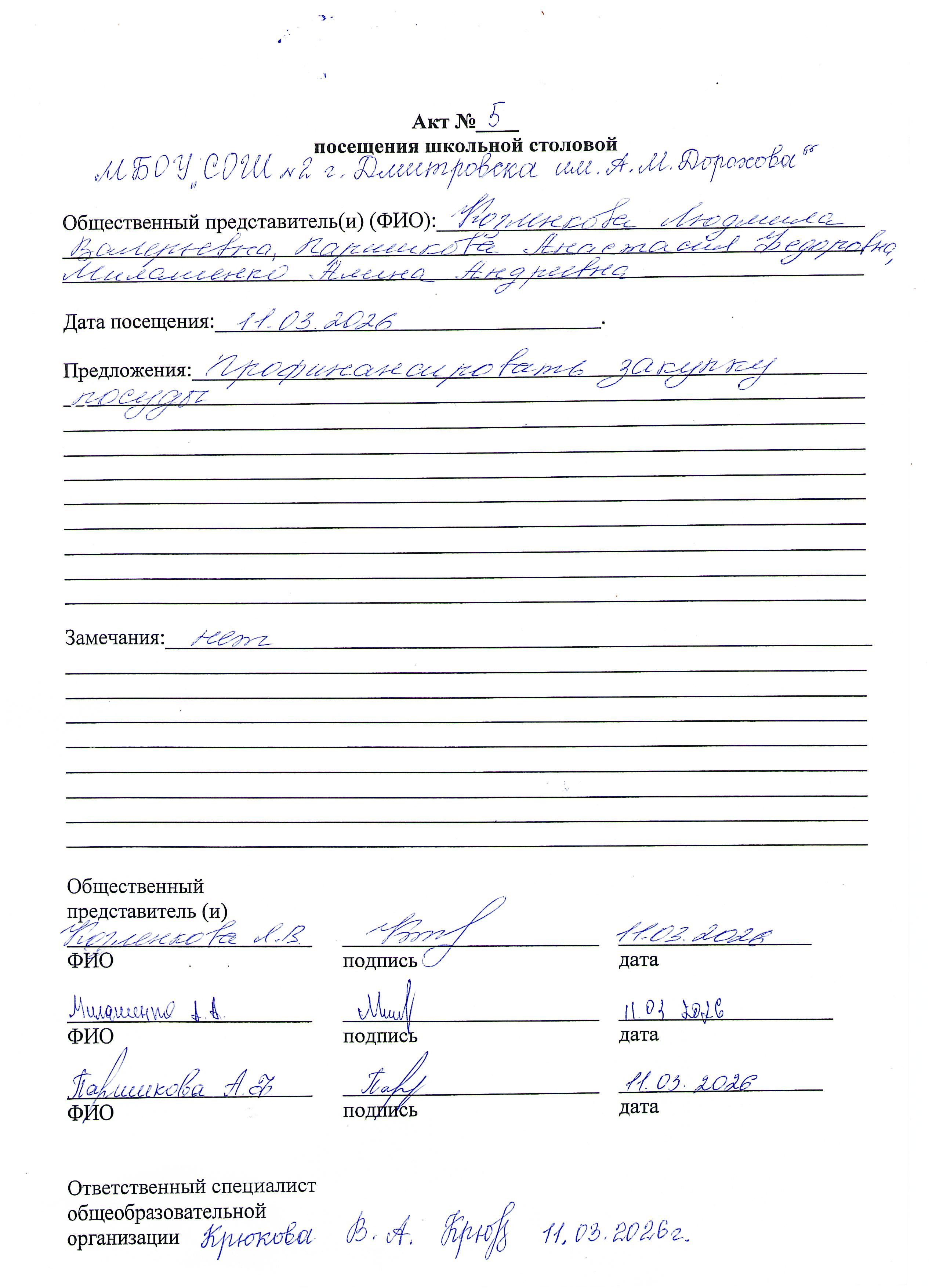 Акт №5 посещения школьной столовой представителями Совета родителей